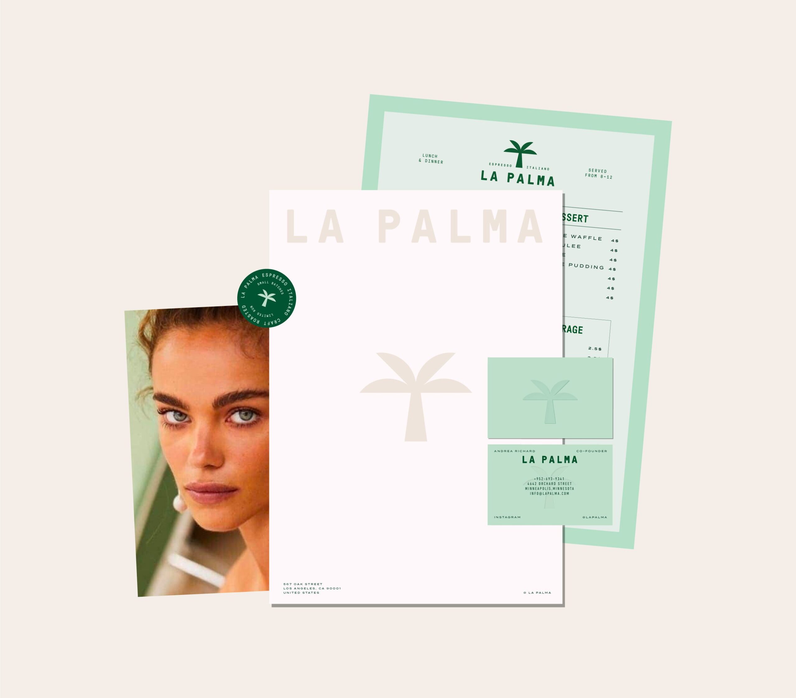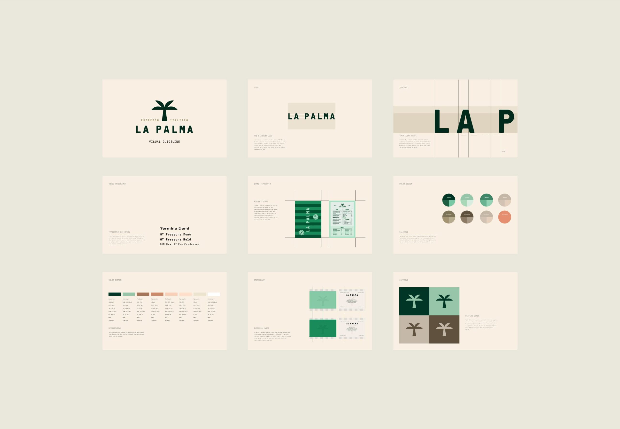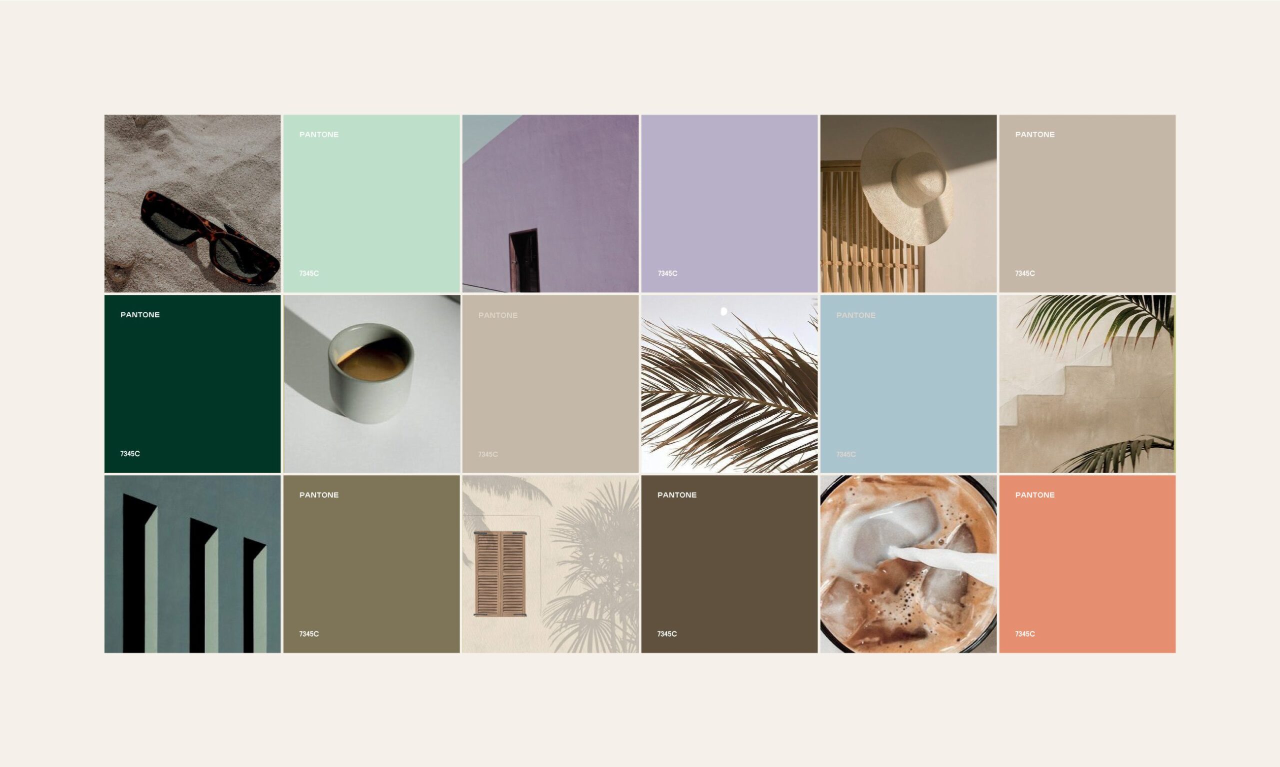 The visual identity draws directly from nature and architectural calm. A restrained color palette of soft greens, warm sands, muted earth tones, and gentle pastels reflects palm leaves, stone surfaces, sunlight, and shadow. These tones create a relaxed and balanced visual rhythm across all touchpoints.
