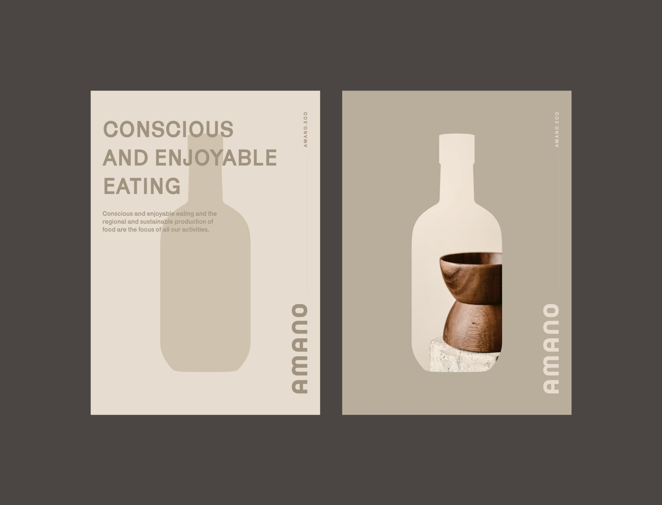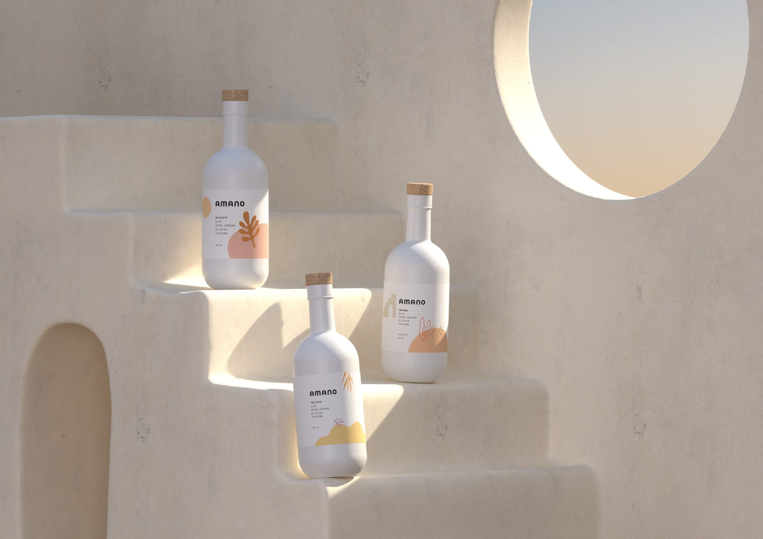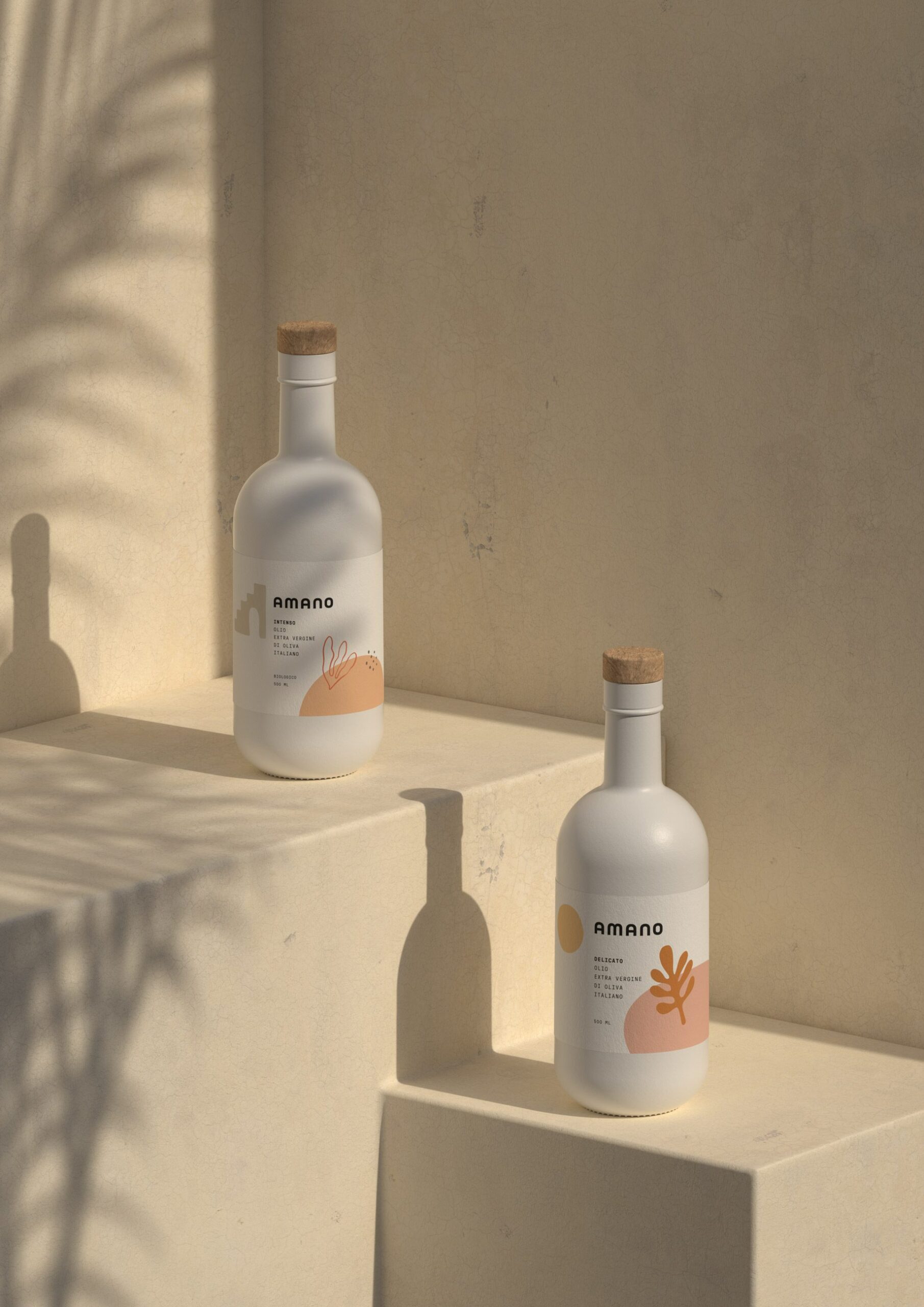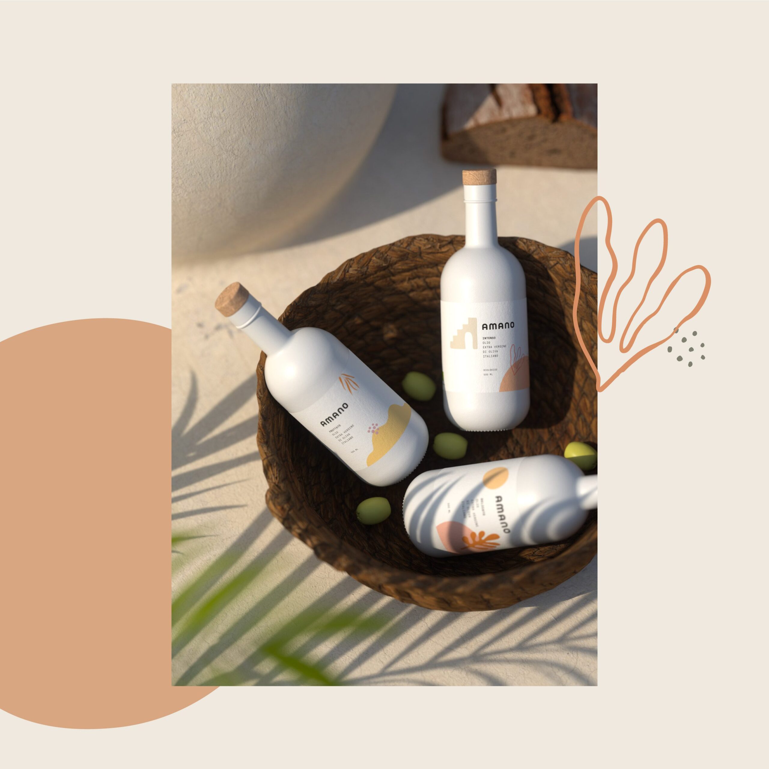 Packaging for Amano Olive Oil and balsamic vinegar was developed with simplicity and functional readability in mind. Labels feature illustrated ingredient patterns set against white backgrounds to support clear information hierarchy and visual harmony. Bottles and packaging materials were chosen to evoke associations with purity and intentional presentation.