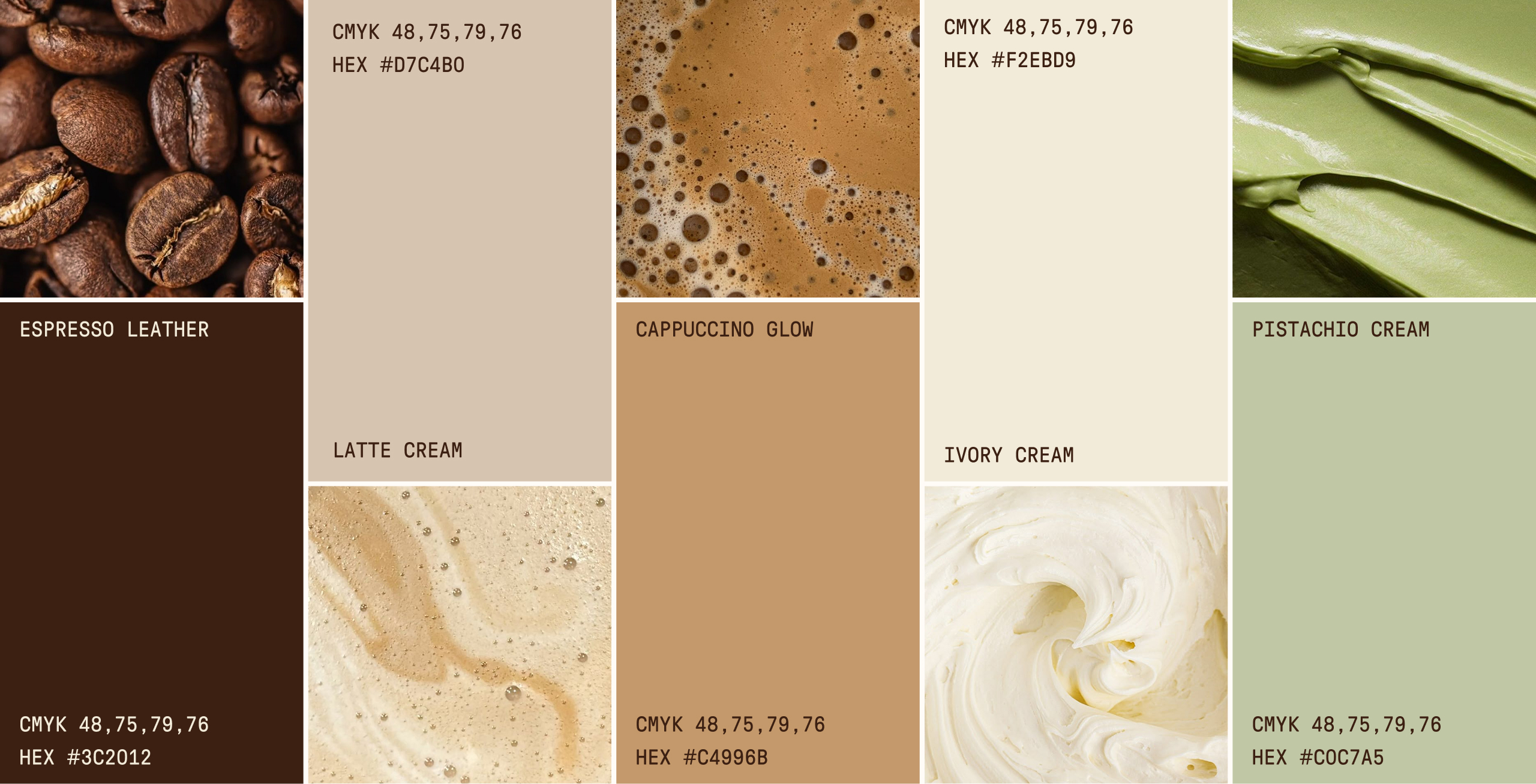 We explored typefaces that echo vintage automotive elegance. The custom logotype reflects the curves of chrome details and leather interiors. The color palette was carefully chosen to merge coffee hues with roadster-inspired tones — from Espresso Leather to Pistachio Cream. Each shade serves both emotional warmth and luxury appeal.