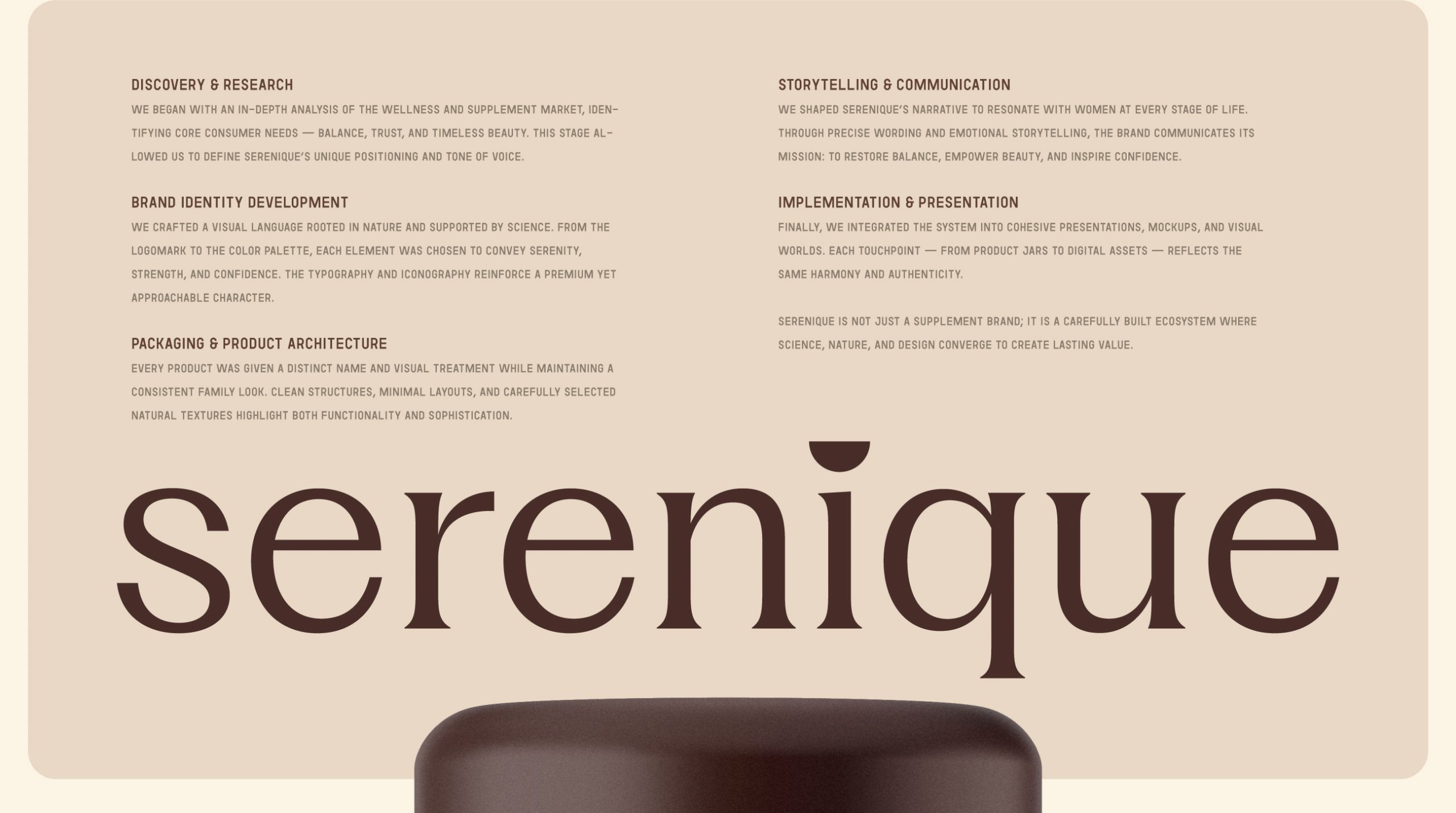 We began with an in-depth analysis of the wellness and supplement market, identifying core consumer needs — balance, trust, and timeless beauty. This stage allowed us to define Serenique’s unique positioning and tone of voice.